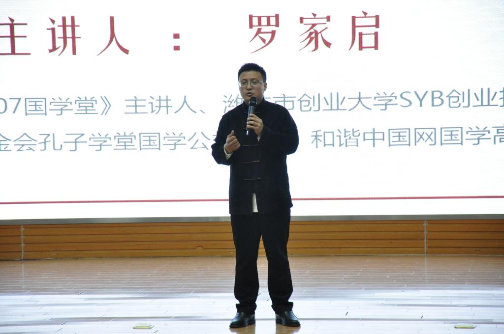 罗家启老师还给师生讲解了国学基础知识,介绍了“德侔天地,道冠古今”的孔子如何修《诗》《书》,定《礼》《乐》,序《周易》,作《春秋》,儒家思想影响中国几千年。引导大家把传统智慧运用于读书学习、日常生活,从经典中学习做人道理、人文精神、道德理念,让大家深深感受到了优秀传统文化承载的至理常道和透射的人文光辉,感受到了中华民族上下五千年来深沉的精神追求,十分有助于帮助师生树立传承和践行中华优秀传统文化的自觉意识。