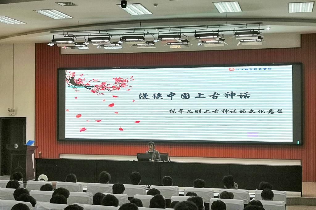 主讲人聂凌燕副教授自1990年7月参加工作以来,一直从事语文教学与研究工作。聂老师在讲座中开宗明义,指出神话是一个民族和国家的宝贵精神财富,是一个国家和民族文化的基因,是人类一代代传承下来的人类童年时期的历史记忆。她从上古神话传说与其他神话传说的不同之处入手,引导同学们了解上古神话是中华文化的源头,蕴含中华文化的基因,具有深刻的文化意蕴;通过创世自然神话(盘古开天地、钟山之神烛阴),英雄救世神话(鲧禹治水)以及部落战争神话(共工怒触不周山),帮助同学们认识到中国上古神话中所蕴含的自我牺牲精神和奉献精神,追求理性和光明、乐观进取、刚健有为、自强不息的执着奋斗精神,以及天人合一、亲近自然、敢于担当、胸怀天下的价值追求。她鼓励同学们从传统文化中汲取知识和力量,指导自己的学习和生活,坚定文化自信。