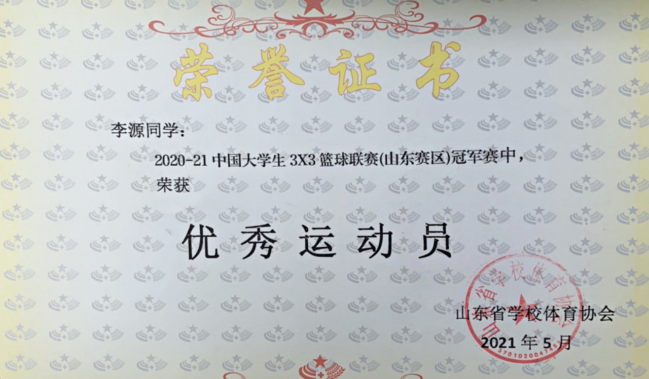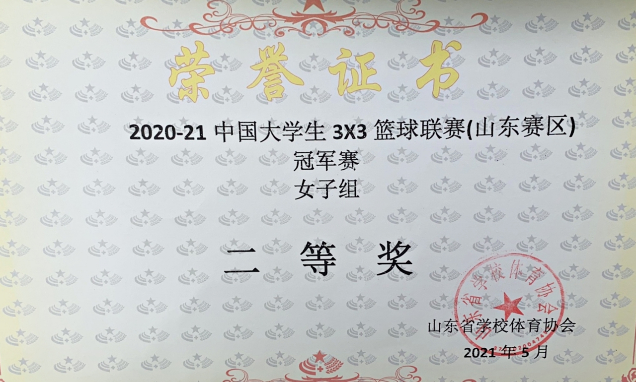 5月7日至9日,由山东省学校体育协会主办的2020-2021中国大学生3×3篮球联赛(山东省冠军赛)在山东大学千佛山校区举行,来自全省的39支学校代表队参加比赛。我校代表队与本科院校高水平代表队同场竞技,不畏强敌,顽强拼搏,最终获得“2020-21中国大学生3x3篮球联赛(山东赛区)冠军赛女子组”二等奖的好成绩,李源同学荣获“优秀运动员”称号。